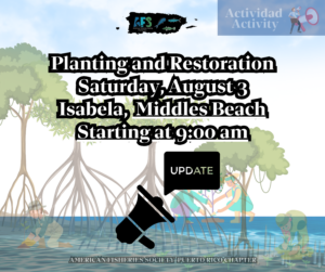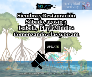 Recordatorio de actividad “Siembra y Restauración”/ Reminder of activity “Planting and Restoration” August 3, 2024 Activities Recordatorio de nuestra actividad: Fecha: 3 de agosto, 9:00 am Lugar: Playa Middle, Isabella ¡No faltes! —– Reminder of our activity: Date: August 3rd, 9:00 am Location: Middles Beach, Isabela Don’t miss it! Tagged Under: #AFS, #conservation, #fisheries, #PuertoRicoChapter, #science